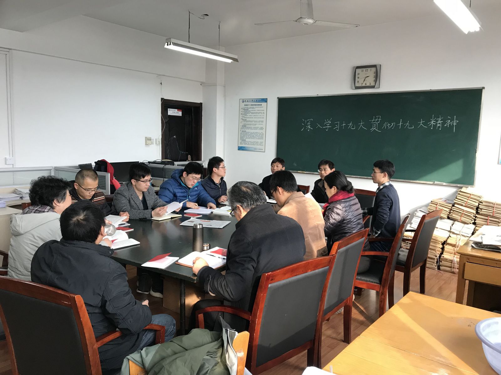 作为高校基层支部党员,大家竭力奋斗在科研、教学第一线,纷纷表示:要紧密团结在以习近平为核心的党中央周围,听党指挥,为国家、党和人民的高等教育事业努力奋斗。全体党员一致认为,党的十九大报告内容丰富、旗帜鲜明、思想深邃、催人奋进。张利、曾亿山、夏链、王玉琳、陈兵等老师纷纷发言,大家结合工作、团队建设、人才培养等谈了自己的看法,坚定表示要学做结合,重在做事,爱岗敬业,不忘初心,撸起袖子加油干。