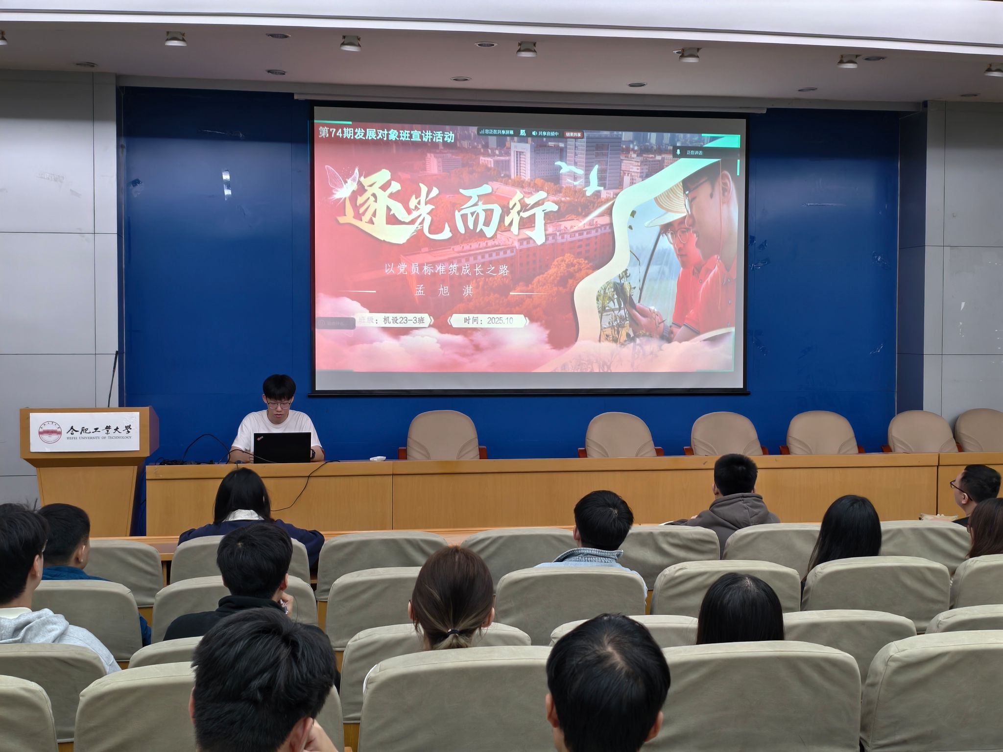 10月15日,公司第74期发展对象班举办了以“榜样力量引前行,赤诚初心向党心”为主题的研讨交流会。活动邀请中共预备党员、校十佳社会公益标兵孟旭淇同学作专题分享,旨在通过榜样的引领作用,激励全体学员坚定理想信念、锤炼能力本领,以实际行动积极向党组织靠拢。