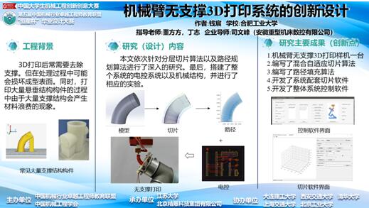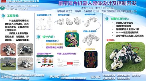 钱宸同学的参赛作品《机械臂无支撑3D打印系统设计》,来源于2019年国家级老员工创新创业项目,依次设计了混合切片算法与路径规划算法,搭建了整体系统并进行了实物打印,验证了通过机械臂托台式的结构完成无支撑的3D打印模式的可行性。刘潇翔同学的作品《履足式复合机器人整体设计及控制开发》,提出了一种基于物联网的多地形适应的四足履带可变形复合式机器人的设计方案,能够在四足机器人与履带车两种形态之间进行快速切换,具有非常高的灵活度与环境适应能力。