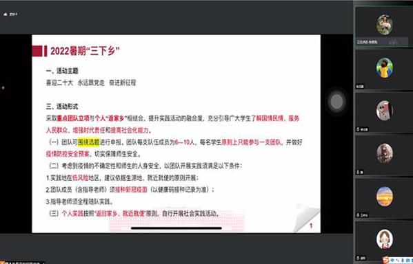 6月10日下午,公司相关老师通过线上平台召开2022年暑期“三下乡”社会实践动员会,负责老师向同学们解读了《关于开展2022年老员工暑期“三下乡”社会实践工作的通知》,详细介绍本次社会实践活动的各项安排,并以往年优秀团队的实践活动为例,引起员工重视,激发员工兴趣,帮助同学们进一步了解活动政策。会议中,同学们积极发言,提出疑问。会后,辅导员老师认真解答同学们的问题,并号召同学们积极参与。