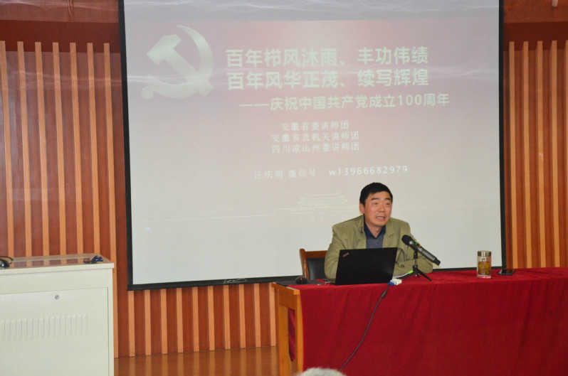 报告会上,汪庆明教授从百年中国共产党栉风沐雨铸就辉煌、风雨兼程展示成功“秘诀”、新时代“长征”路任重道远、风华正茂再创伟业四个方面系统阐述了中国共产党百年的光辉历程、伟大成就和宝贵经验。汪教授深刻阐释了中国共产党为什么“能”、马克思主义为什么“行”、中国特色社会主义为什么“好”。他用严谨的理论、生动的语言、鲜活的事例分析了中国共产党永葆先进性和纯洁性、获得人民拥护和支持、实现长期执政的原因,讲述了党带领全国人民探索跨越“六大陷阱”、破解“六大疑问”、打破“三个历史逻辑”、抓住“第四次现代化机遇”的过程。