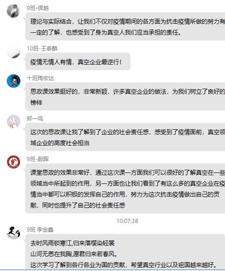为了介绍行业企业情况和培养员工的社会责任感,真空与过程装备系在《真空系统测量与检漏》专业课程线上授课期间,增加课程思政专题,利用课间时间进行了一次“疫情防控与社会责任”特别班会,介绍疫情期间全国部分真空企业在疫情期间保障生产的同时,积极为抗击疫情贡献力量。