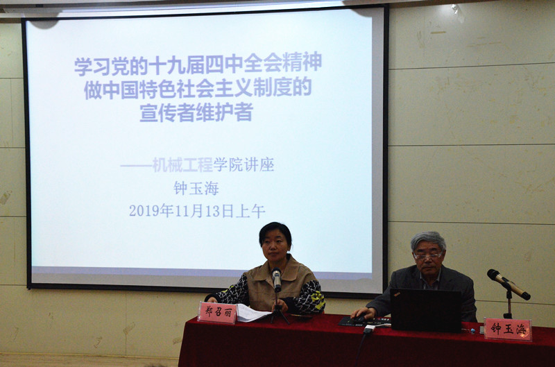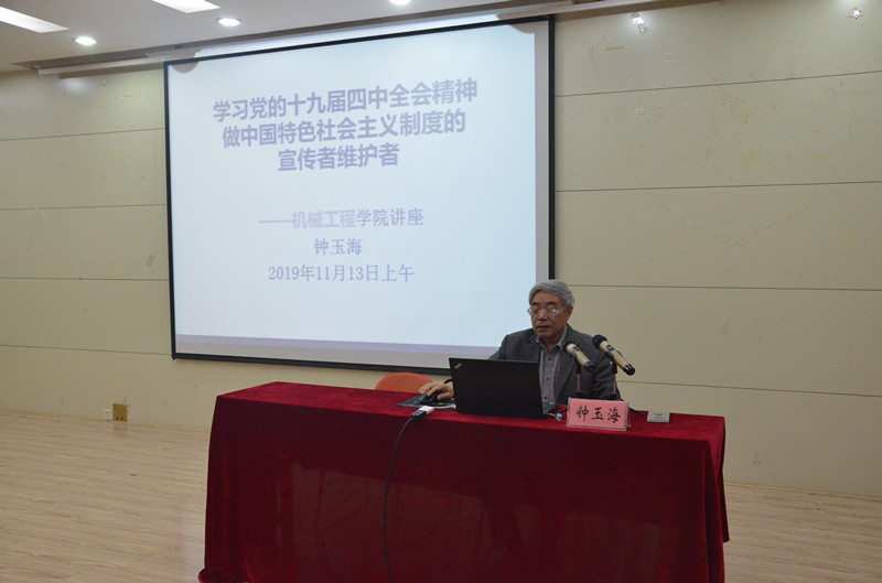 活动中,钟玉海教授结合自身的学习体会,围绕党的十九届四中全会的基本情况、党的十九届四中全会的主要精神、对有关党的十九届四中全会几个重要问题的理解等三个方面对全会内容进行了解读,阐述了会议紧扣一个主题、会议作出一个重要判断、会议给出一个重要结论、会议总结我国国家制度和国家治理体系十三个方面的显著优势、会议提出坚持和完善中国特色社会主义制度、推进国家治理体系和治理能力现代化的总体目标、会议明确坚持和完善中国特色社会主义制度、推进国家治理体系和治理能力现代化的具体路径、会议强调坚持和完善中国特色社会主义制度、推进国家治理体系和治理能力现代化,是全党的一项重大战略任务等,他指出,学习党的十九届四中全会精神,要与“不忘初心、牢记使命”主题教育结合起来,统筹谋划,要和公司的改革发展结合起来,要从深化改革、全面提升公司的治理体系和治理能力现代化水平的高度来保证公司更好更快地发展,确保公司的办学优势和特色更加鲜明、更加突出。