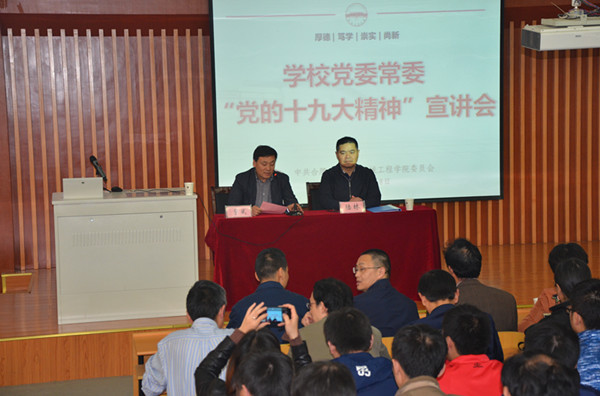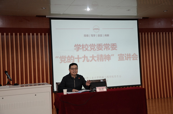 陆林书记分别从党的十九大盛况,党的十九大主要精神,中央纪委工作报告主要精神,中国共产党章程修正案主要精神,十八届中央委员会决议的精神,十八届中央纪律委员会报告精神,中国共产党章程修正案决议主要精神,习近平总书记在党的十九大闭幕会上重要讲话精神等八个方面给我们作了宣讲,陆林书记强调,要紧紧围绕在以习近平同志为核心的党中央周围,每位党员要自觉践行“四个意识”, 把着力点聚焦到习近平新时代中国特色社会主义思想是党必须长期坚持的指导思想上,聚焦到5年来党和国家事业取得历史性成就和发生历史性变革上,全校师生要通过理论学习,实践活动等方式,全面理解和把握党的十九大精神的核心要义,担负起自身的历史使命!