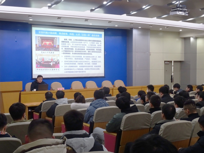 訾斌老师从理论学习、专题报告、科研研究思路、基础研究、产教融合、科研管理和服务等11个方面向同学们阐述了必须深刻把握新时代新征程实施科教兴国战略的新内涵、重大意义和实现路径。