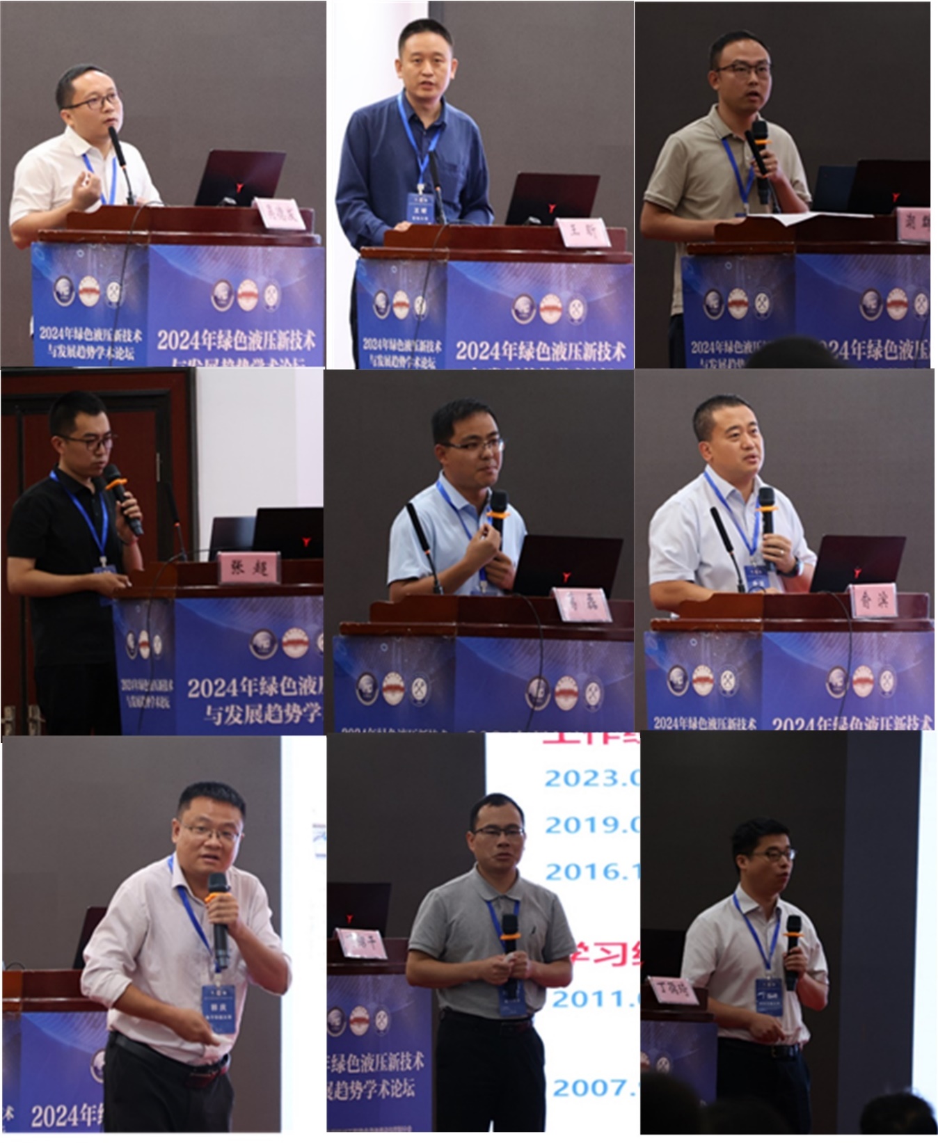 本次论坛特邀18位青年人才专家学者、工程技术人员做专题学术报告,报告内容回归学术研究,涉及研究方向广泛、前沿,涵盖了“绿色液压”的液压领域。学术论坛学术报告上午场环节,华中科技大学吴德发教授做了题为“深海水液压绿色驱动技术”的报告;吉林大学王昕教授做了题为“组合式数字液压技术研究”的报告;安徽理工大学黄家海教授做了题为“电动挖掘机电液混驱回转系统研究进展”的报告;华东交通大学丁孺琦教授做了题为“负载口独立电液控制技术”的报告;北京理工大学周俊杰研究员做了题为“机器人用高性能电液作动关节技术研究”的报告;上海交通大学潮群副教授做了题为“机理-数据融合驱动的液压柱塞泵故障诊断与健康评估技术”的报告;北京航空航天大学张超副教授做了题为“机载流体动密封失效机理与寿命预测”的报告;太原理工大学葛磊副研究员做了题为“变面积液压缸驱动构型与技术”的报告。下午场环节,燕山大学俞滨教授做了题为“足式机器人液压驱动与仿生”的报告、电子科技大学郭庆教授做了题为“基于模型的电液伺服系统控制技术与应用”的报告、厦门大学叶绍干研究员做了题为“高速轴向柱塞泵减振降噪关键技术研究”的报告、浙江大学黄伟迪助理研究员做了题为“电控变量柱塞泵智能故障诊断方法研究” 的报告、北京工业大学尹方龙副研究员做了题为“高效能反渗透海水淡化能量回收技术研究” 的报告、兰州理工大学刘新强副教授做了题为“液压伺服滑阀阀口小开度冲蚀行为与性能退化研究”的报告、TapTap点点曾亿山教授团队张涛老师做了题为“聚变装置维护液压机器人设计与安全控制研究”的报告、安徽中液机电科技有限公司闵玉春总经理做了题为“轴向柱塞式液压泵马达的核心零部件的研讨”的报告、合肥长源液压股份有限公司唐祥先总经理做了题为“齿轮液压泵马达的关键技术问题研讨”的报告、丹佛斯动力系统控制事业部中国区研发总监马忠孝做了题为“电气化趋势下的液压多路阀发展方向”的报告。