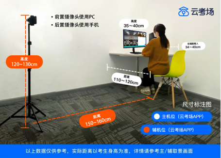 5、设备摆放要求:网络远程面试主设备,需要正向面对考生,复试全程开启,摄像头正对考生。复试过程中,要求视频中考生双手和头部全程在视频录像范围。网络远程面试监考及备用设备,摆放在考生侧后方(与考生后背面成45°角),能够全程拍摄考生本人和电脑屏幕,复试全程开启。