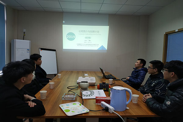 带队老师田崇浩向公司介绍了公司近年来的发展情况及应届生就业情况。公司技术部部长、2011届员工董成为公司师生详细介绍了公司过去的运营机制及发展状况。目前公司已圆满完成第一个生存下来的五年计划,进入飞速发展期,今年实现了从4000万到1亿元的突破。后续将进一步加大和公司的合作,增进员工间的联系。随后,董成员工带领公司师生参观了工厂车间并对随行的四位应届生进行了面试。