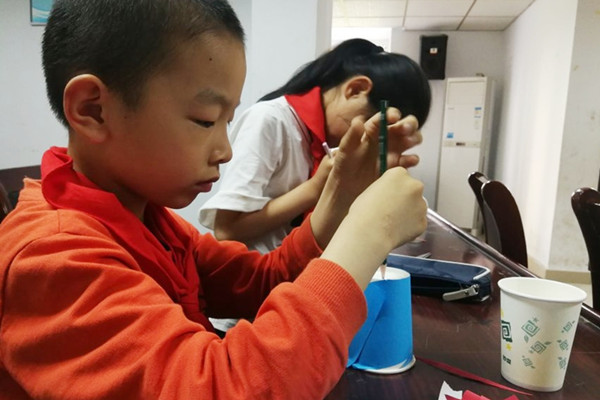 下午四时,志愿者一行四人抵达滨湖社区活动中心,在和孩子们进行了亲切的交流后,活动正式开始。此次活动共分为两个部分,分别是用废旧纸杯制作小灯笼、用快递盒制作抽纸盒。活动开始前,孩子们分成了四组,每组三到五人。拿到材料后,在志愿者的帮助下他们很快将自己的纸杯包上喜欢的彩纸,在裁剪纸杯的过程中,小组内互相协作,井然有序,半小时后,一盏盏小灯笼便制作完成。有的孩子充分发挥想象力,在灯笼上粘贴自己裁剪的彩纸做为装饰品。制作完灯笼,小组内各成员开始共同制作抽纸盒,在分工合作下,盒子制作完成,之后,孩子们在上面绘制出自己喜爱的图案。五点半,在志愿者打扫完场地后,活动圆满结束。