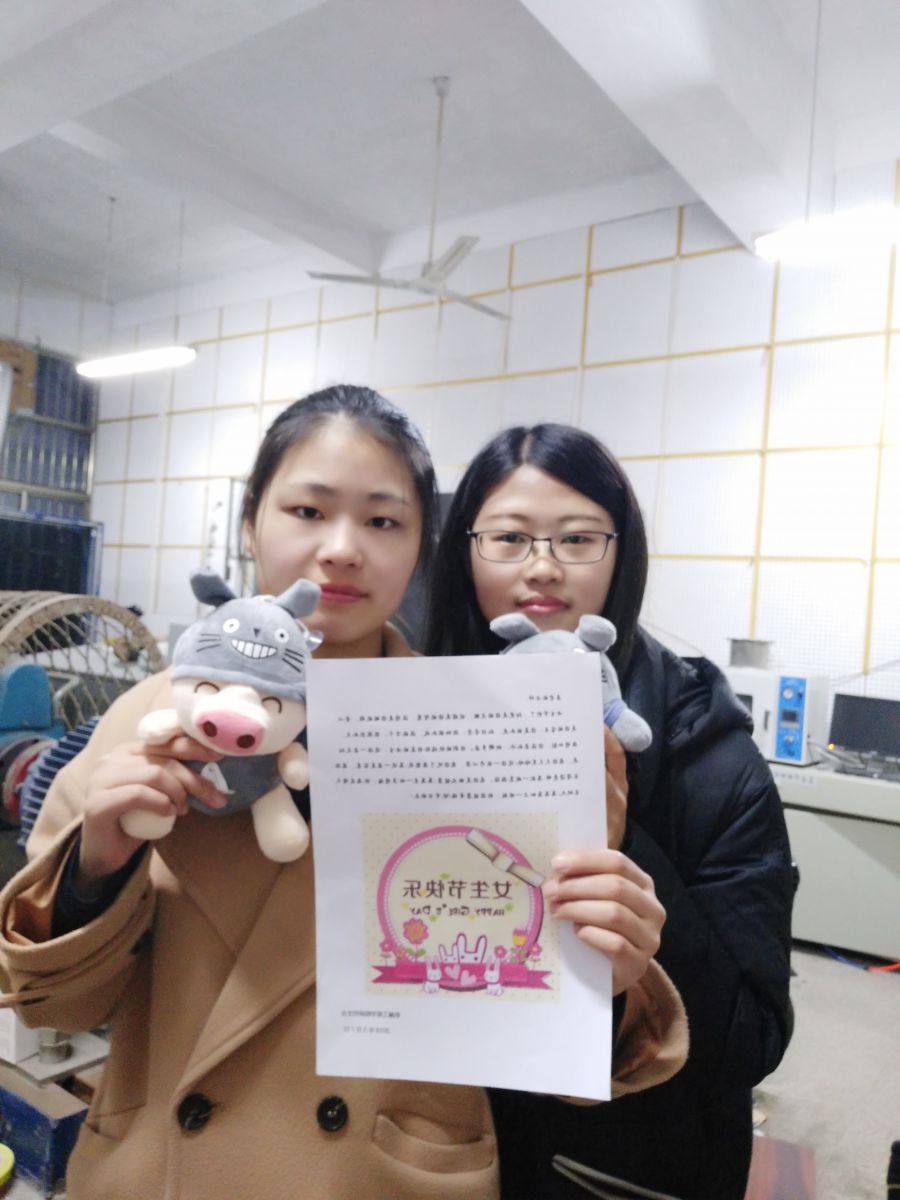 当天上午,公司研究生会的男生们前去城隍庙选购礼物,他们在礼品店精挑细选了许多样式不一、乖巧可爱的玩偶。随后在水果店用多种甜美的水果装成了精美的水果拼盘,完成了此次活动的前期准备。晚上,公司男生自告奋勇,根据前期在机械研会微信众号留言的女神名单,开始了礼物派送。一份水果拼盘,一个精致的玩偶,一份甜言蜜语,由男生们送到女生手上,这些小惊喜带来的不仅是一份关怀,也有一份感动。