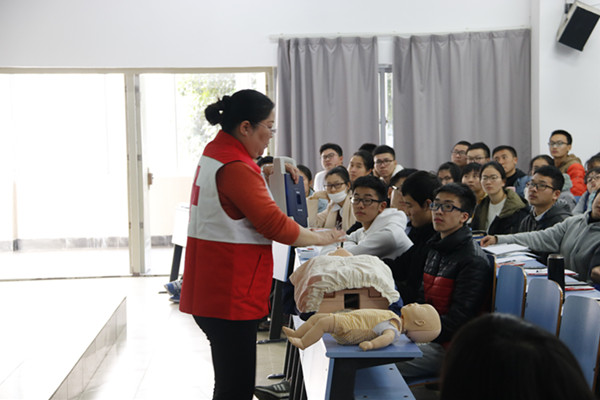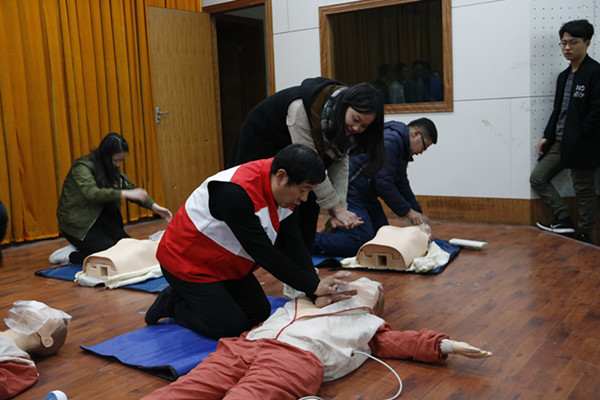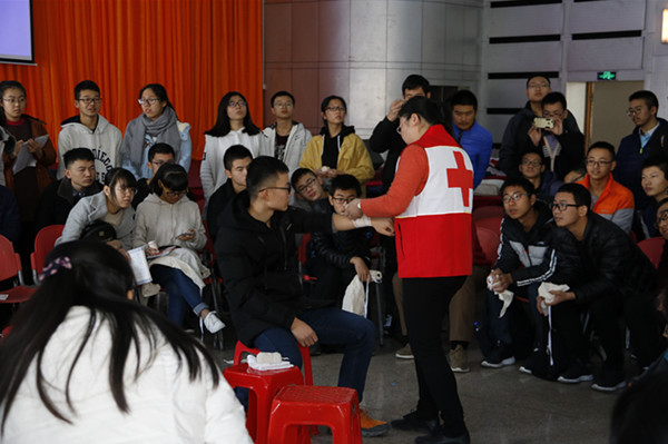 11月22日下午,安徽省红十字会章老师在翡翠湖校区二教101室就红十字运动知识、心肺复苏、创伤救护等方面为学员进行了理论授课并考核。当天晚上在图书馆报告厅,全体学员在三位安徽省红十字会老师的指导下对心肺复苏、电除颤仪的使用等内容进行了训练。26日上午于综合楼301报告厅,学员们进行了包括创伤止血、现场包扎技术、骨折固定等内容的创伤救护实操训练。下午,大家观看学习了“全国红十字应急救护大赛”并分组进行应急演练即成果展示。直至下午三点,学员全部考核通过并将颁发国际认证的救护员证书,应急救护培训顺利结束。